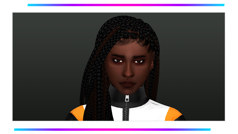 Hairstyle: Thick, chest-length hair tied into box braids, which are adorned with pink and blue hair pipes.